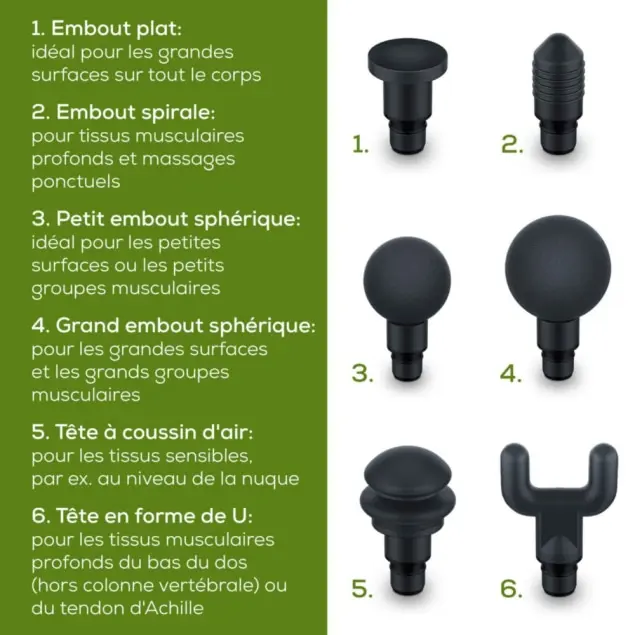 - 6 embouts de massage de haute qualité pour une utilisation personnalisée