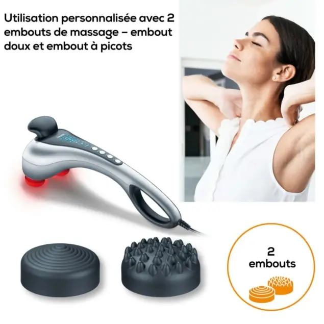 2 embouts de massage interchangeables pour cibler différentes zones du corps (dos, cuisses, épaules, jambes).