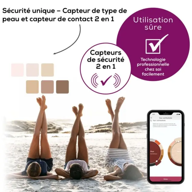 Pour une sécurité optimale, l’épilateur est doté d’un capteur de type de peau, d’un capteur de contact ainsi que d’un filtre UV intégré, afin de protéger efficacement votre peau.