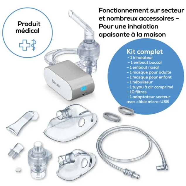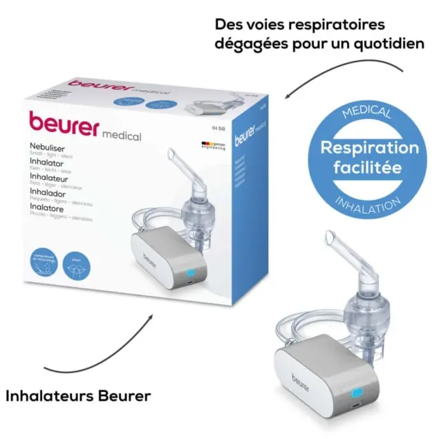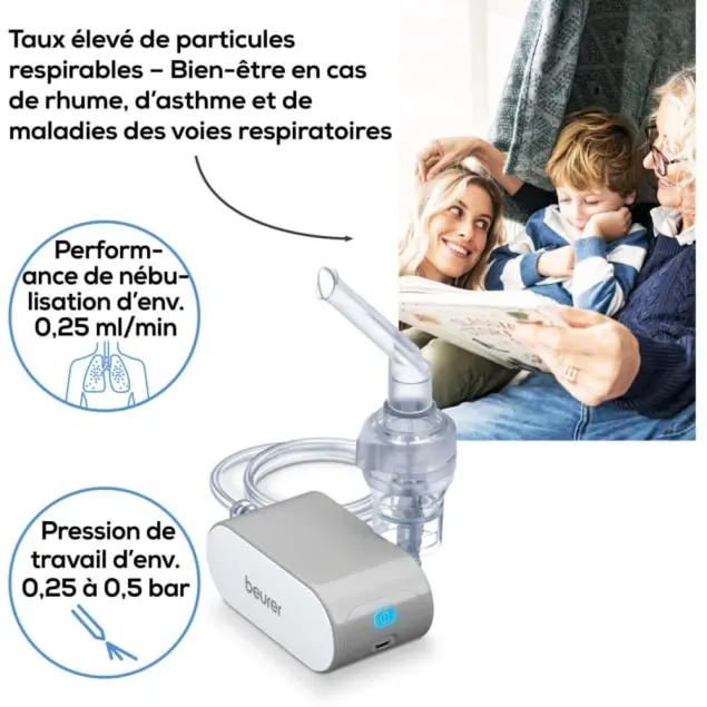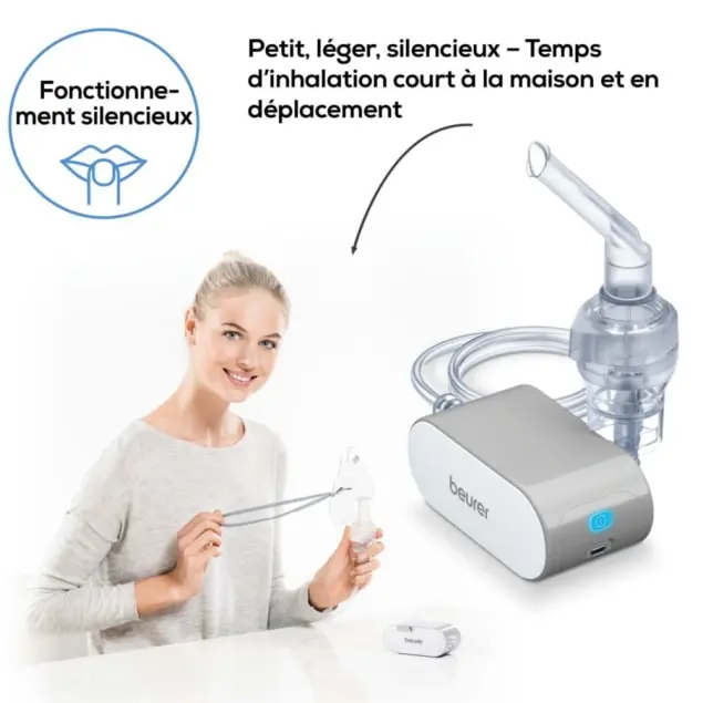 nébuliseur portable Beurer, nébuliseur IH 58, inhalateur électrique silencieux, nébuliseur voyage compact, appareil de nébulisation air comprimé, traitement asthme et rhume.