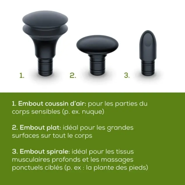Trois embouts pour personnaliser le massage selon les zones du corps