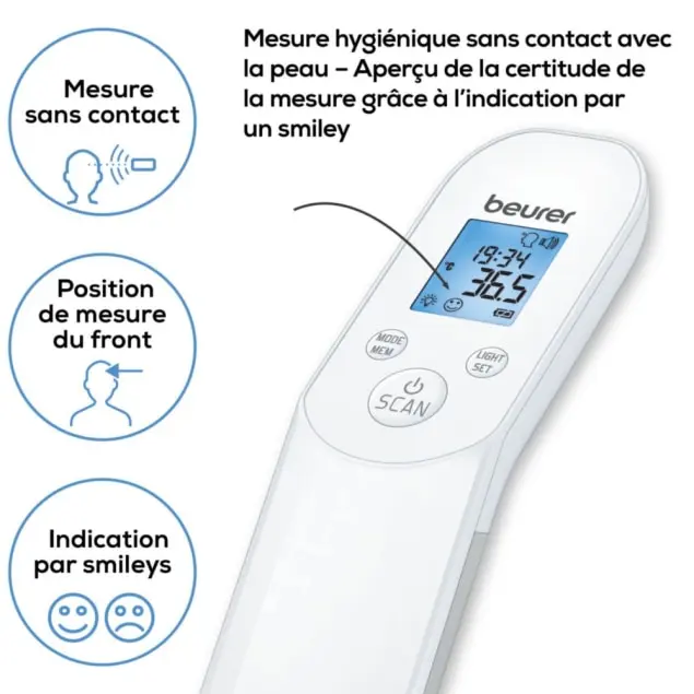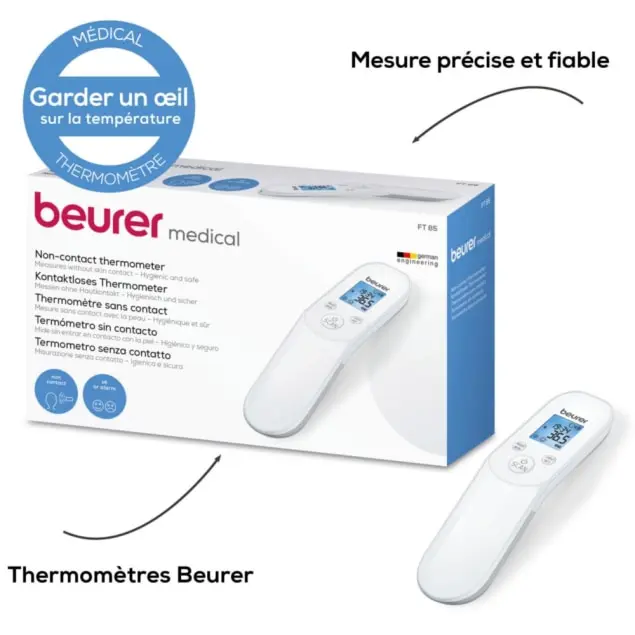 thermomètre infrarouge sans contact, thermomètre Beurer FT 85, thermomètre digital frontal, thermomètre sans contact précis, thermomètre fièvre adulte enfant, thermomètre hygiénique rapide.